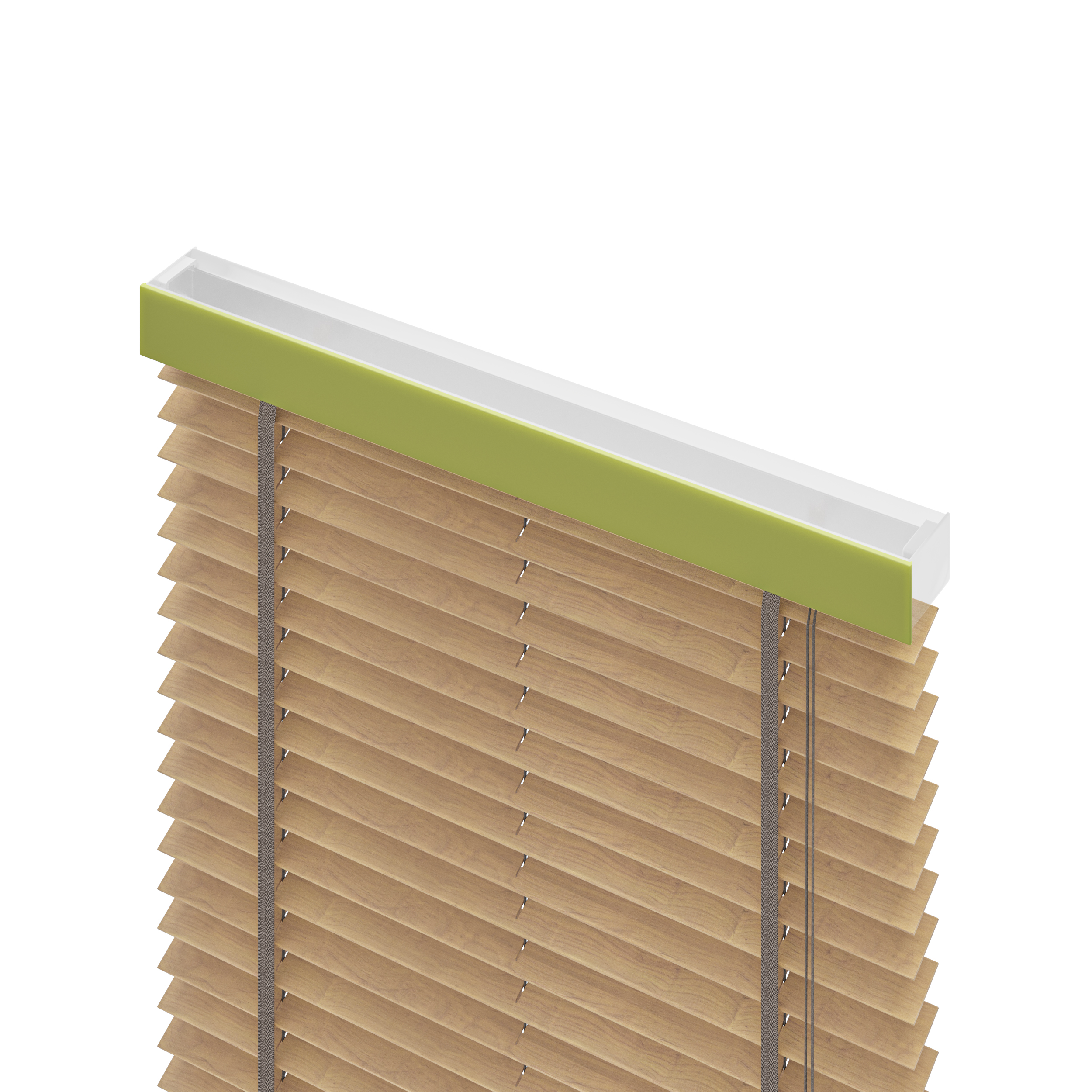 La cantonnière est un habillage en bois, du même coloris que les lames qui vient se fixer sur le coffre métallique du store en bois satiné pour le cacher.